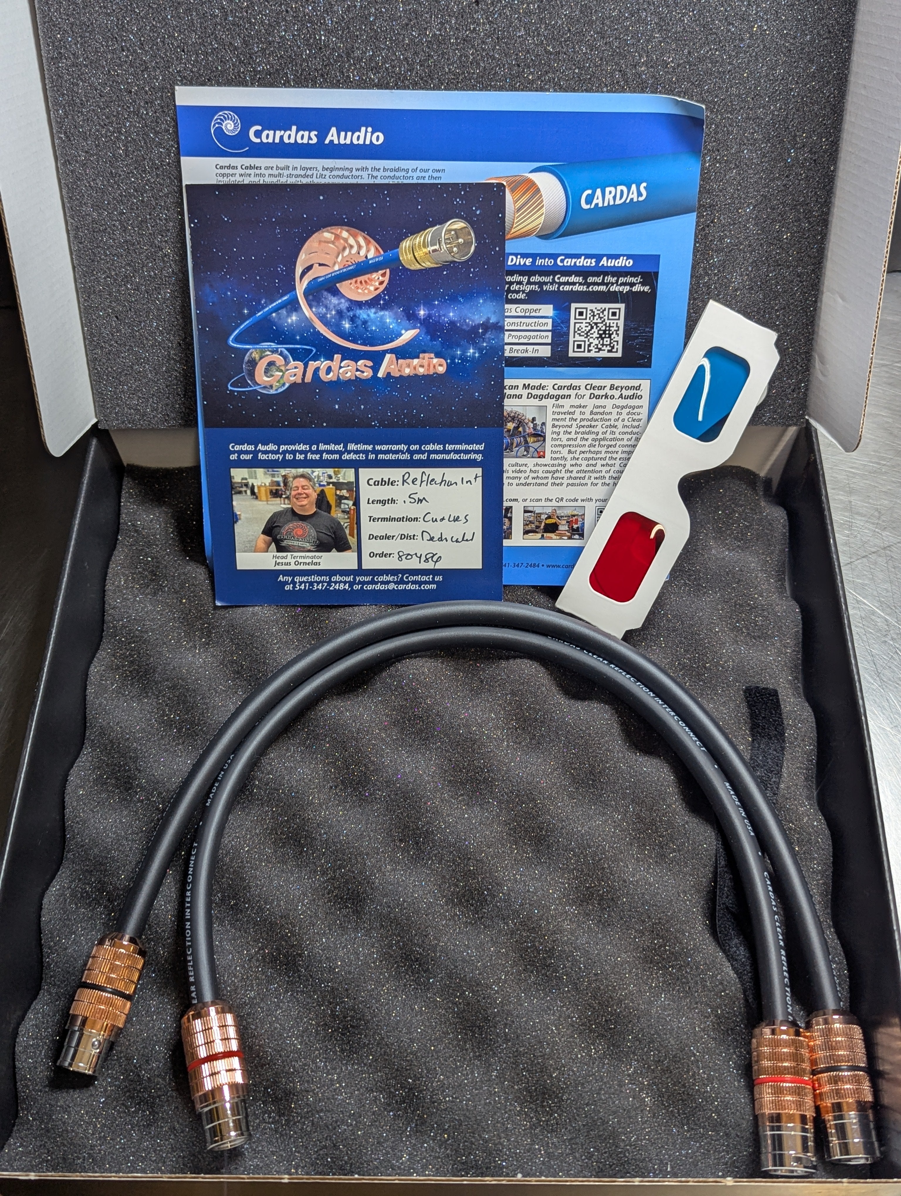 Finished in black ultra soft extruded TPR jacket, Cardas Clear Reflection Interconnect is terminated with Cardas SRCA-CU RCA terminations or CG XLR-CU. The gauge is 2x25.5 AWG with an outside diameter of 0.420”/10.66mm.