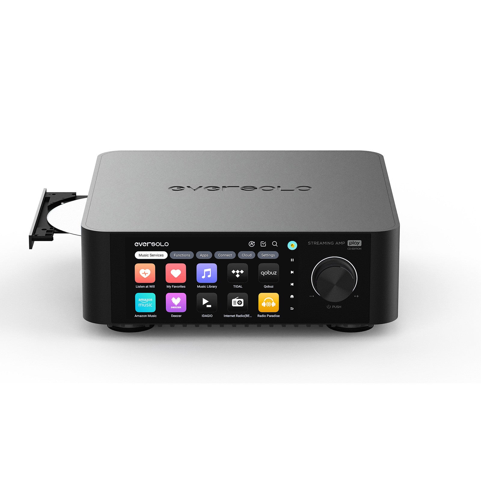 Eversolo placed a 5.5” screen on the Play CD Edition’s front panel with six categories to choose from: Music Services, Functions, Apps, Connect, Cloud, and Settings. Then use the panel to select from a wide range of streaming services.