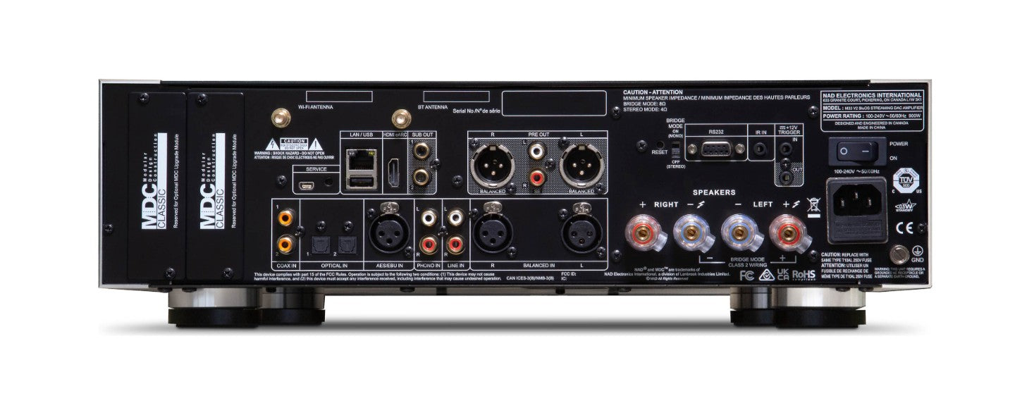 In its standard configuration, the NAD M33 V2 BluOS streaming amp is a complete system—just add speakers. HDMI eARC, digital and analog inputs, a premium MM/MC phono stage, and balanced XLR stereo amplifier inputs and preamp outputs provide everything you need for today and tomorrow. For future expansion, two MDC slots allow for the addition of new modules like the MDC USB DSD, enabling DSD playback and USB audio support. Dual independent subwoofer outputs now offer higher output than the original M33, allowing users to expand easily into multi-subwoofer, Dirac-optimized systems—ideal for home theatre enthusiasts or those seeking reference-grade 2-channel power amp performance with integrated streaming.